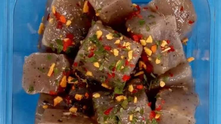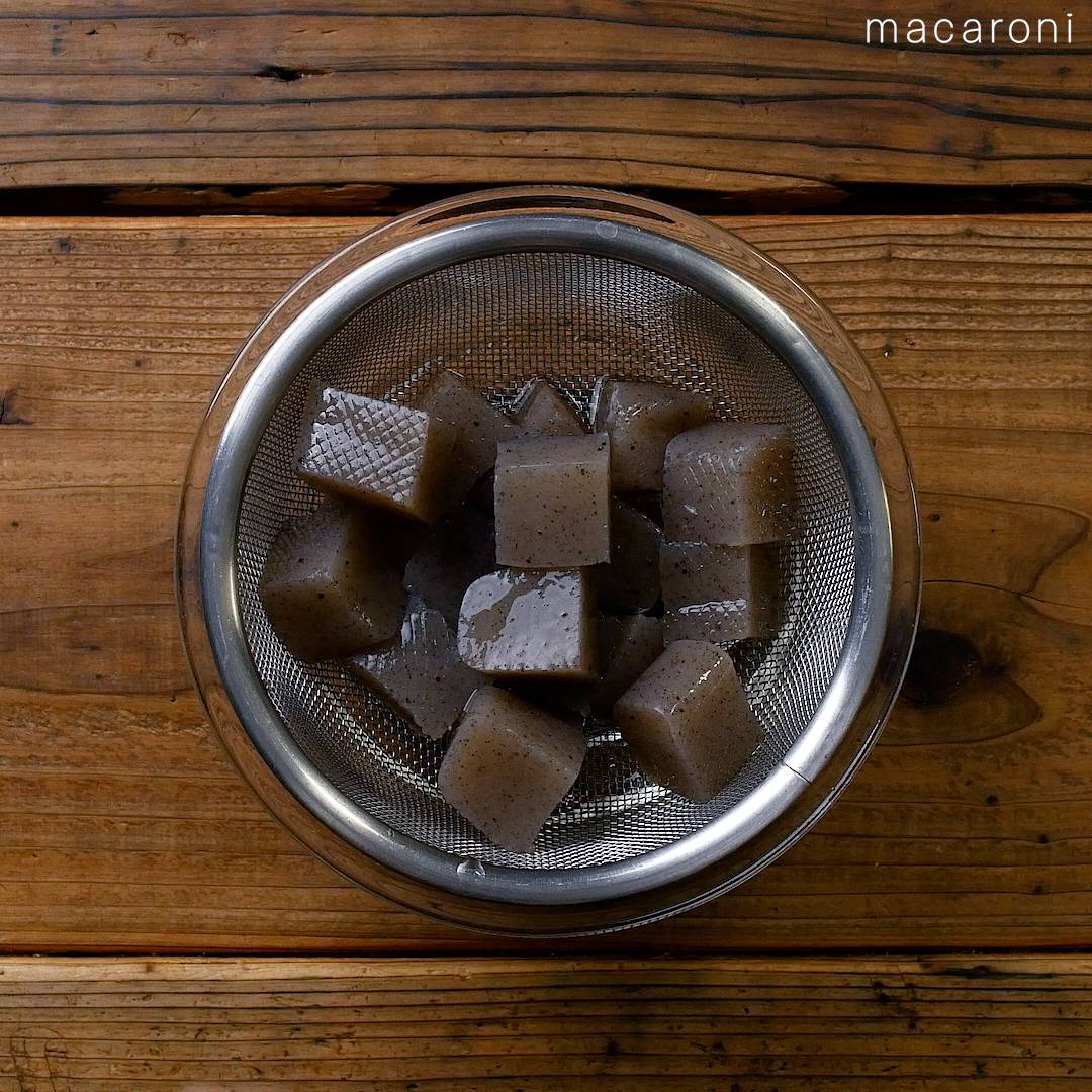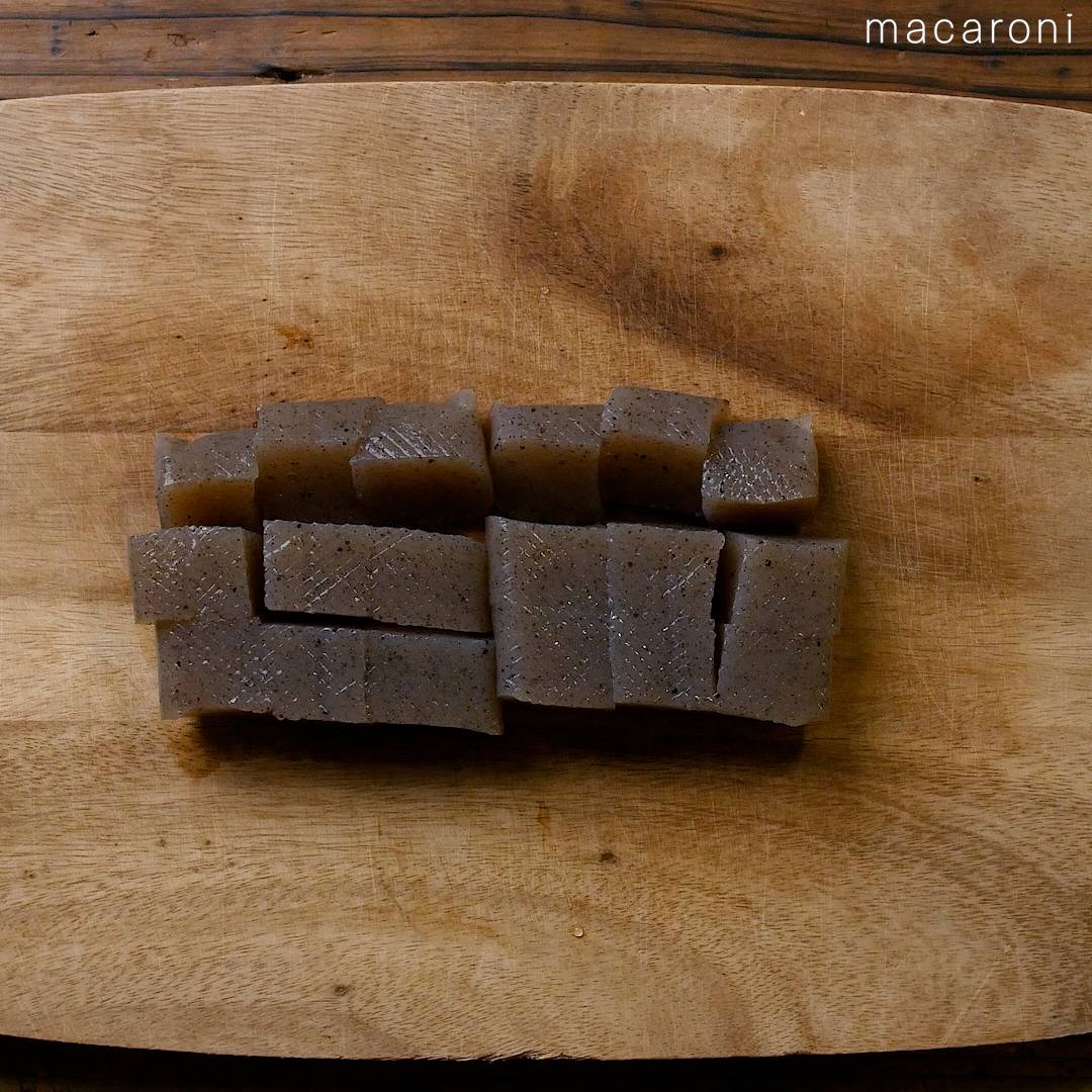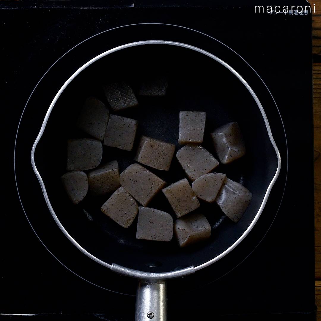 1: こんにゃくの両面にネギカッターで格子状に切り込みを入れ、大きめの角切りにします。