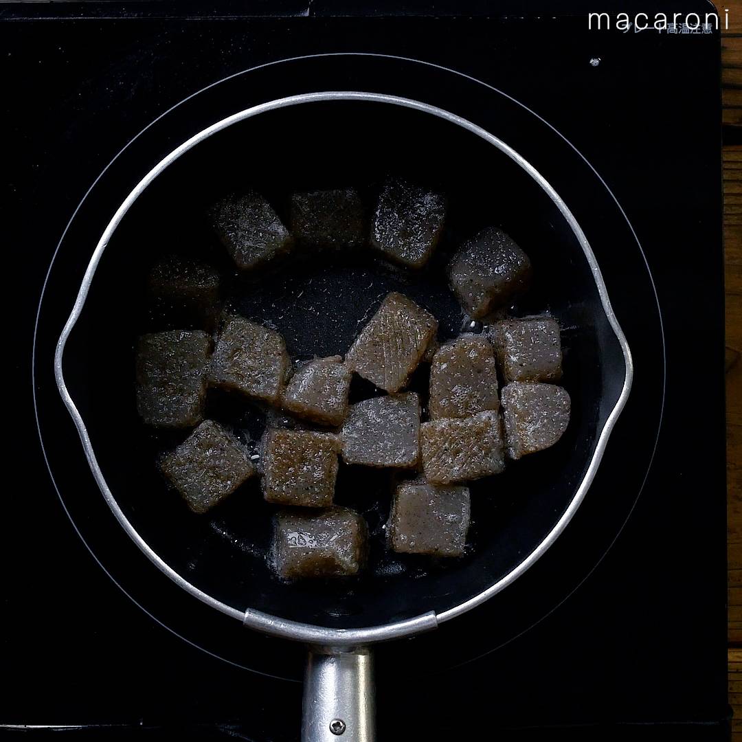 4: ごま油を加えてこんにゃくを1分炒めます。