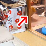 なんとTVを乗せている棚の襖が開いており、そこからひめちゃんがお顔を覗かせていたとか!どうやらお客さんが怖くて棚の中に隠れていたようです。こんな場所でひめちゃんを発見するとは思っていなかったため、「えっ、どうやって入ったん?」と飼い主さんもびっくり。