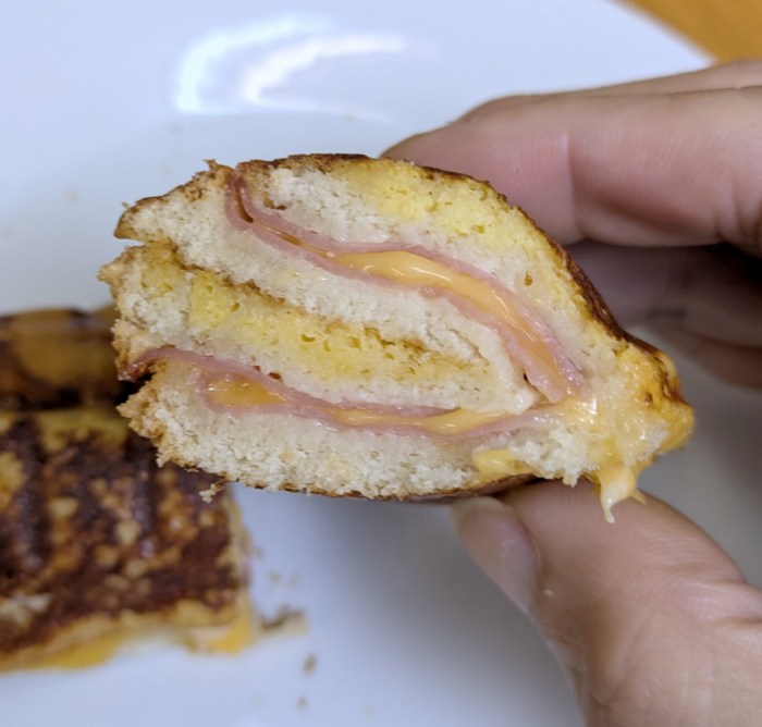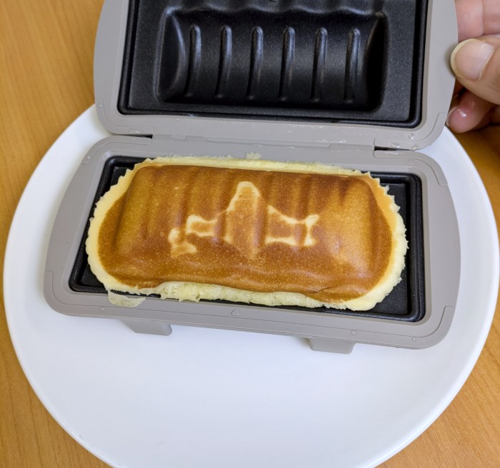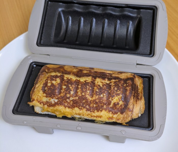 加熱後に、ホットサンドメーカーから水が出ていたので、生地から水分が抜けて小さくなったのだろう。その分、味が濃くなっているのでは?