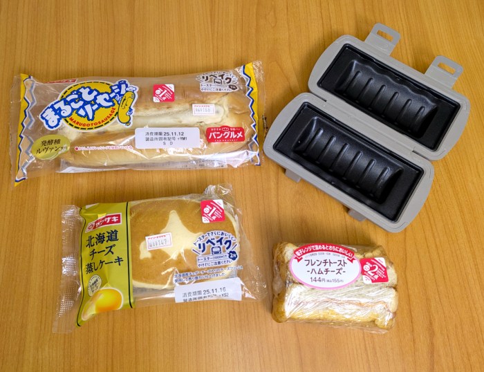 本来は食パン(6枚切 or 8枚切)1枚に具材を挟んで使用するのだが、ほかのパンでもいけるはずと踏んだ私は、デイリーヤマザキで3つの商品を購入してきた。