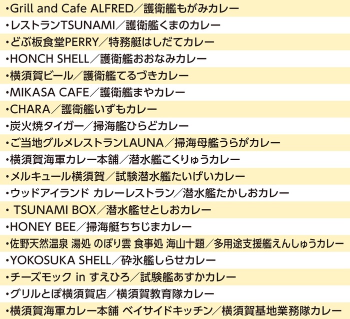 海上自衛隊横須賀地方総監部在籍の艦船に乗り組んでいる給養員長(料理長)からレシピの提供を受け、各店が忠実に味を再現したもの。2015年に16店舗でスタートしたが、すでに退役となっている艦や新型艦の登場などもあり、メニュー化10周年の節目に一新された。艦船と提供店も新たな組み合わせとなっている=表参照。