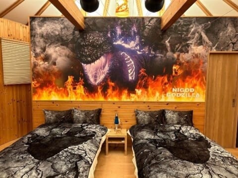 『ゴジラ迎撃作戦』を存分に体験した後は、ニジゲンノモリ内にあるグランシャリオ北斗七星135°のゴジラコラボルーム「怪獣ランド」で、ゴジラの世界観に浸る宿泊体験も可能です。ゴジラ70周年を記念したこの部屋は、歴代ゴジラ映画作品に登場した怪獣たちが大集合した空間となっています。