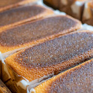 ライ麦入りのフランスパンに、明太子とバターのみのシンプルなペーストをたっぷり。使用している明太子は、黒糖入りの出汁に何度も漬け込んだオリジナルの「黒糖かぶせだし辛子明太子」です。