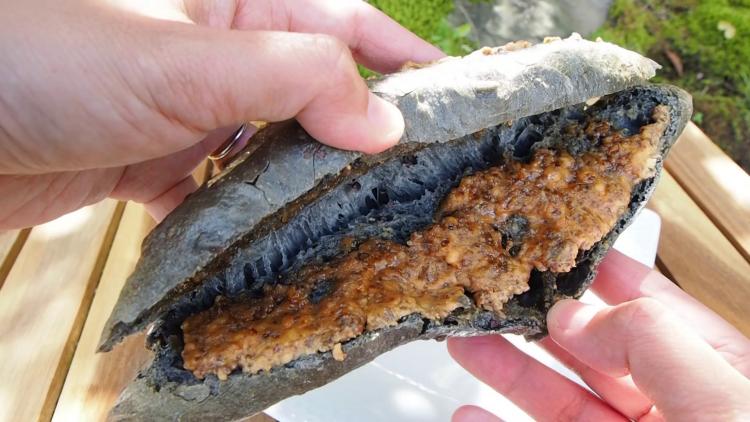 竹炭パウダーと五穀を練りこんだ生地に、粒感のある黒糖ピーナッツクリームがたっぷり。