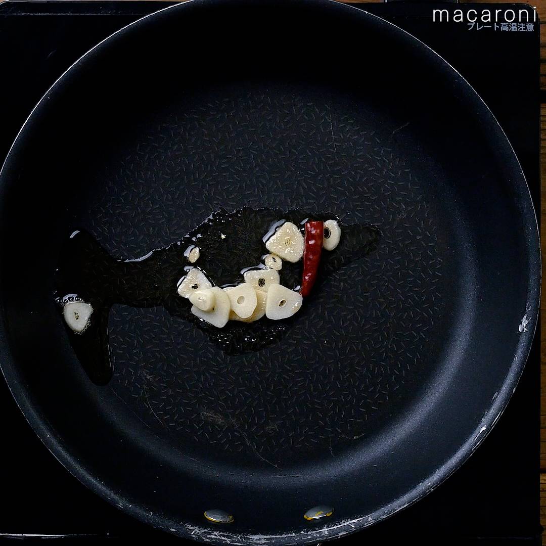 2: フライパンにごま油を引き弱火で熱し、赤唐がらし、にんにくを入れて炒めます。