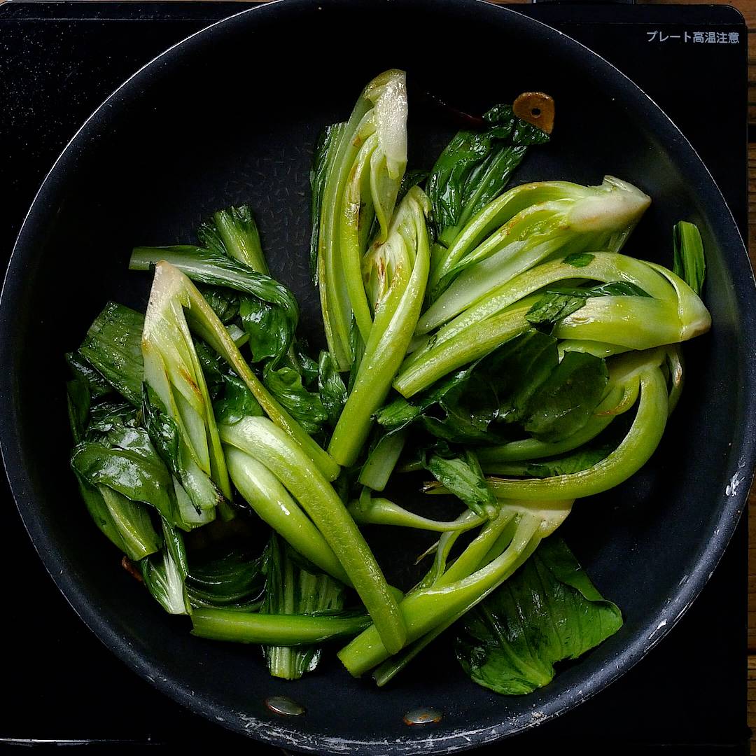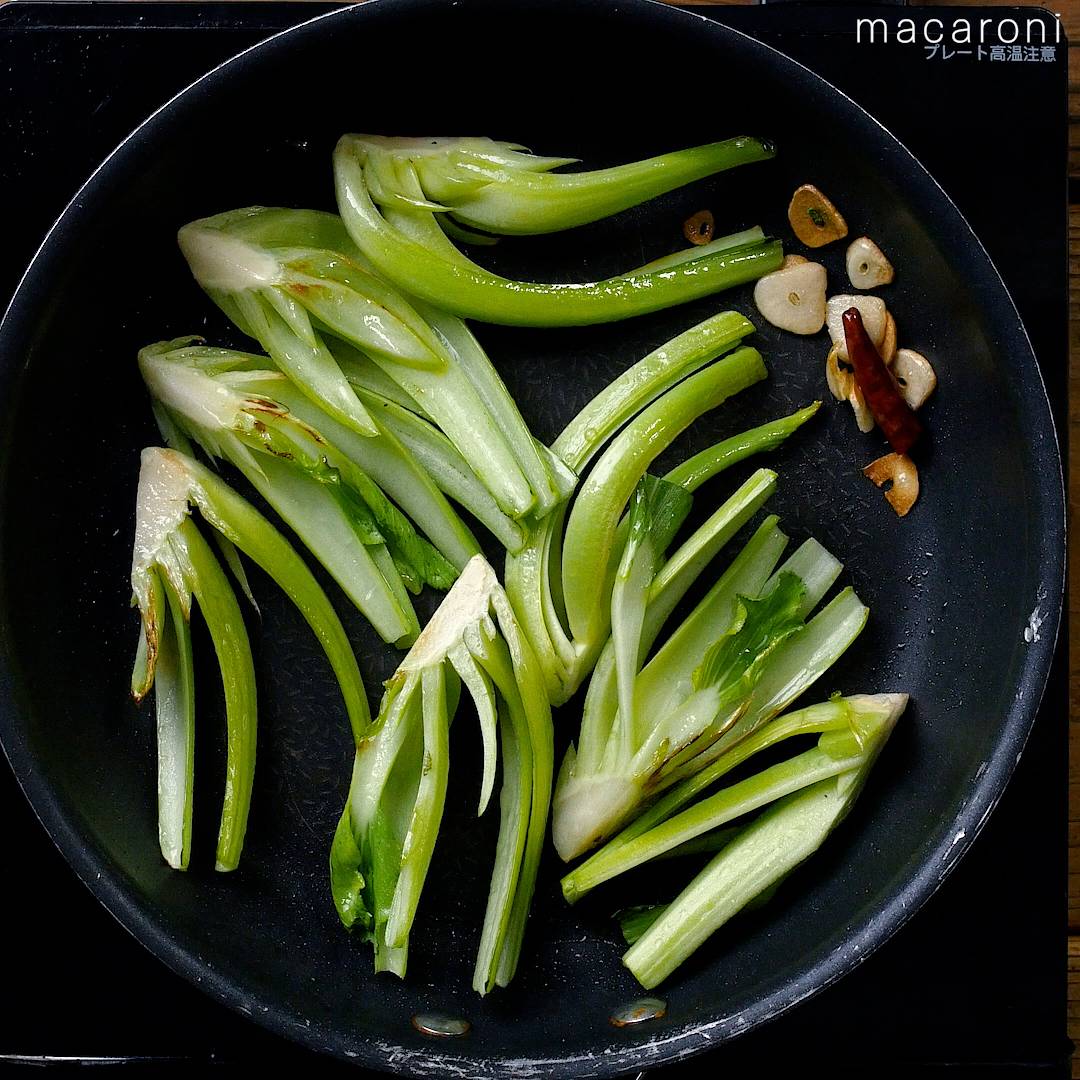 3: 香りがたったら、チンゲン菜の茎を入れて炒めます。酒を加えてフタをして1分加熱します。