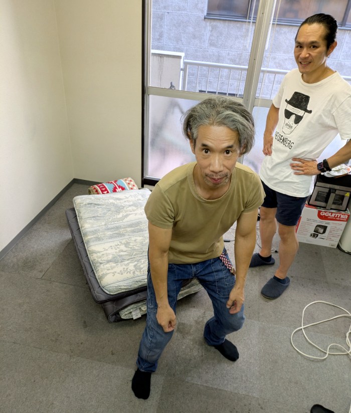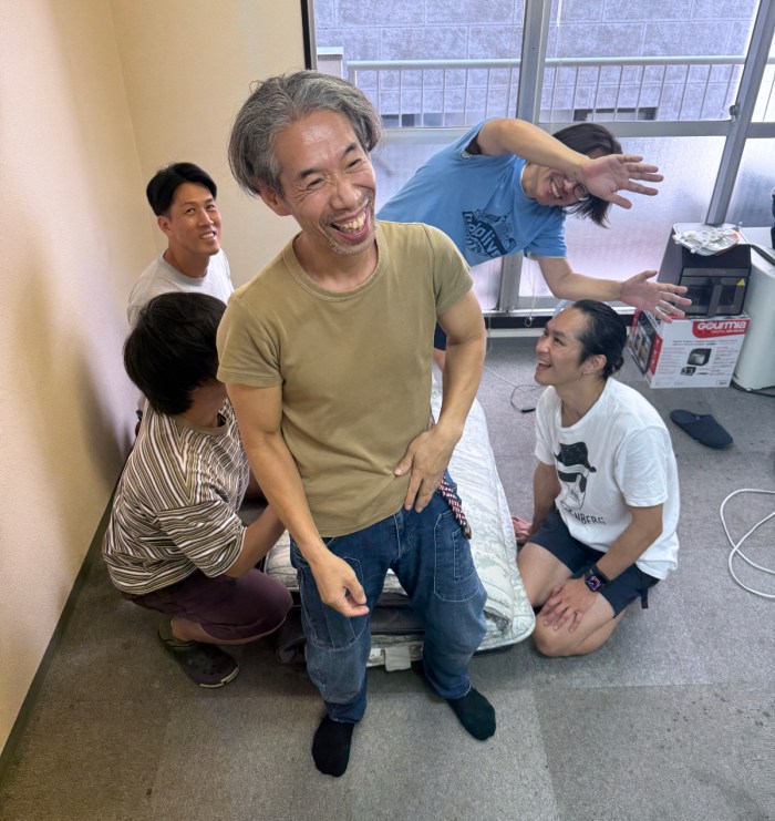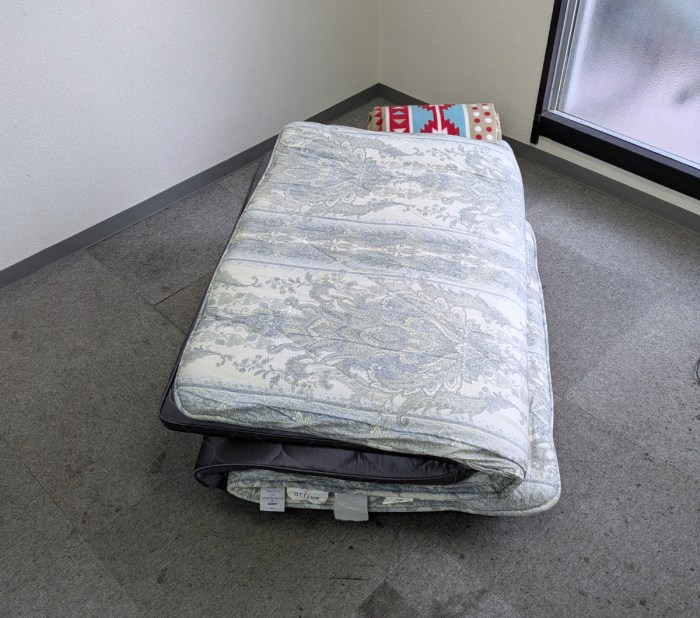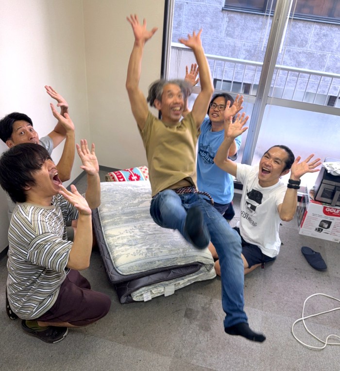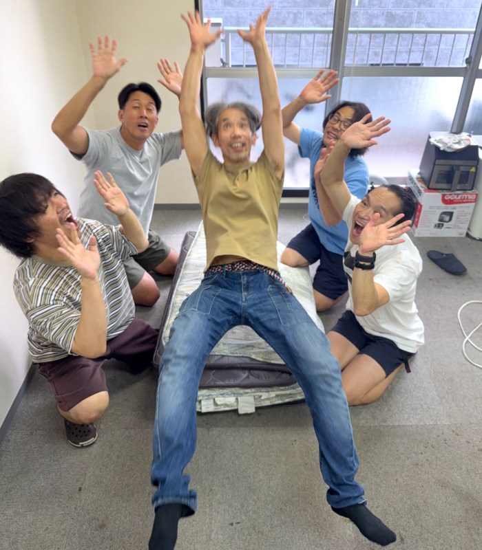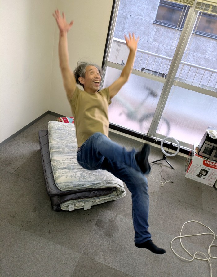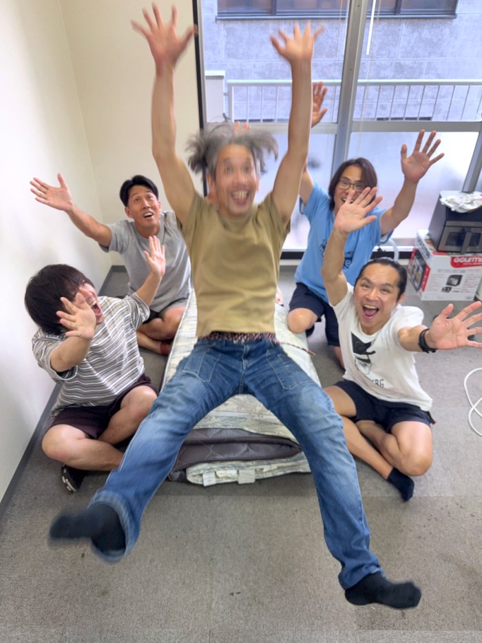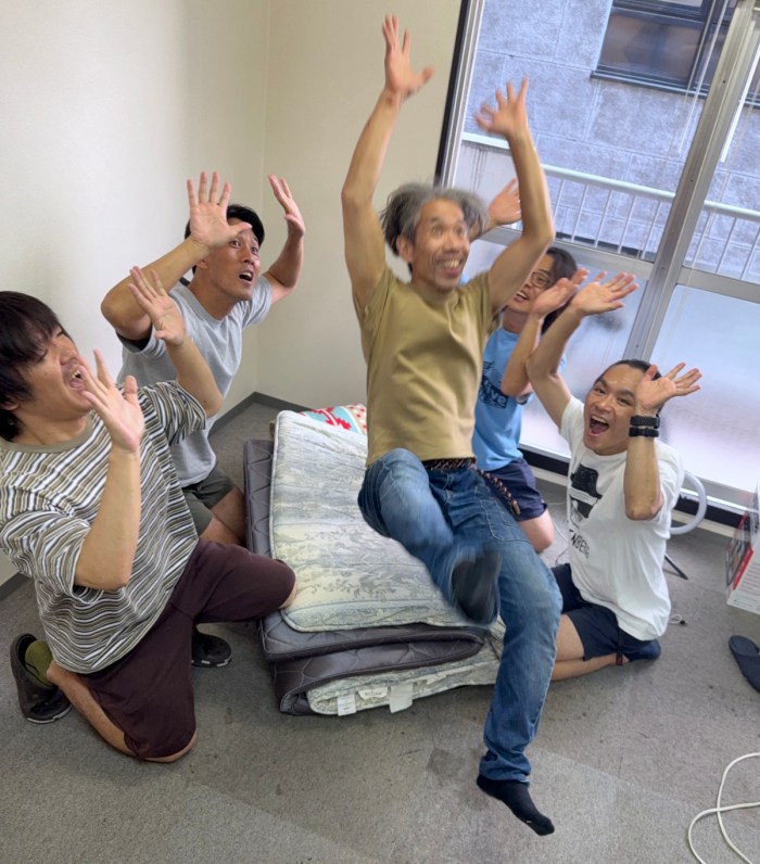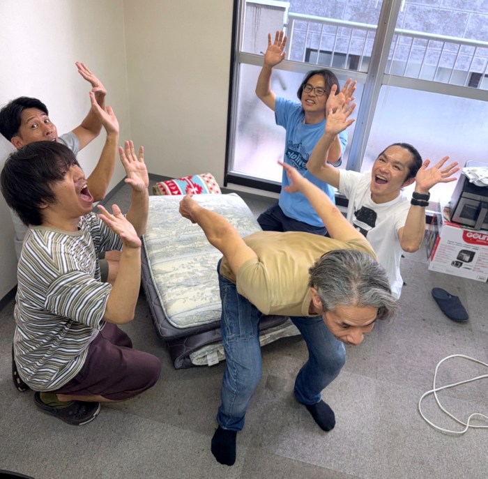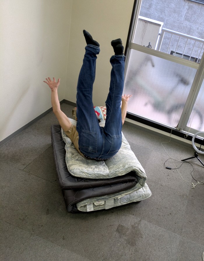 そこで私は、上げずに胴上げっぽくなる方法を考えた。編集部にあった布団を置き、上げてもらう人がそこに背中向きでジャンプ! その左右に手を伸ばした人物を4人程度配置すれば良いはずだ。