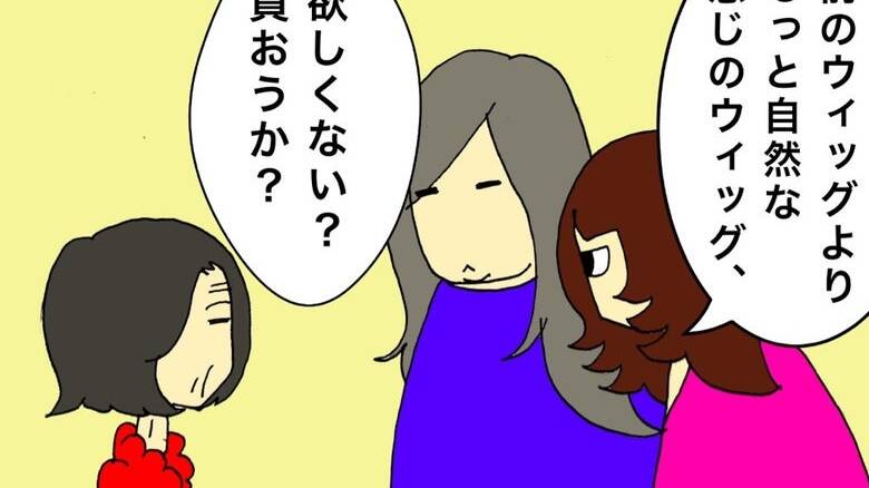 あーちゃんがウィッグをつけなくなってから、ずいぶんたちました。以前はお出かけの必須アイテムだったので、ワフウフさん姉妹は新しいものが欲しくないかとあーちゃんに確認しましたが「いいわ、このままで」とのこと。以前、父にウィッグを買ってもらったことや、父から「老けて見えるのは嫌だ」と言われたことをうれしそうに話していたあーちゃんを思い出し、ウィッグをつけて若く見せたかったのは、もしかすると父の存在があったからなのかも……と、ワフウフさんは思っていました。明らかに美への意識が薄くなり、洋服の組み合わせもおかしくなっているあーちゃんを見て、ワフウフさんは複雑な気持ちです。