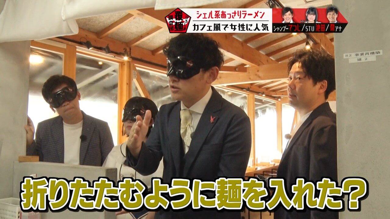 目隠し(通称:覆麺)をして感覚を研ぎ澄まし、至高の一杯を調査する「ひろしま覆麺調査団」。