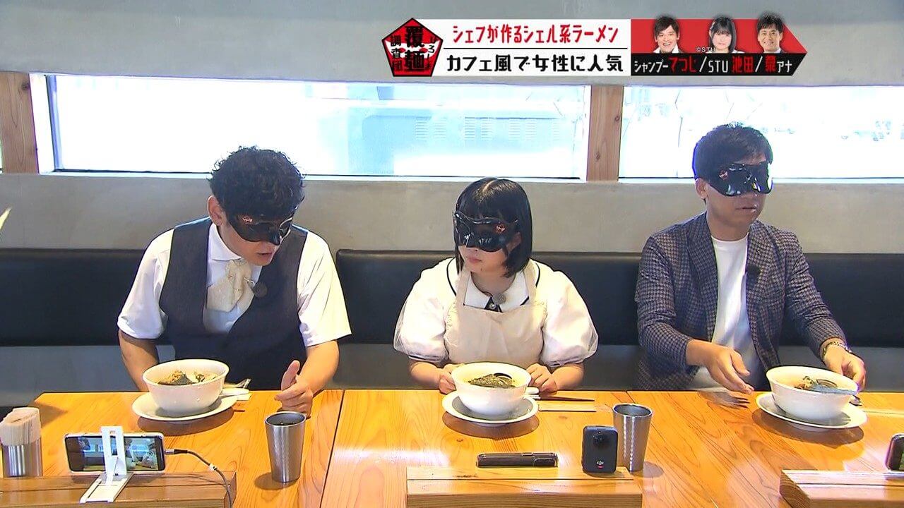 麺の香りについて話す2人の横で、れんげと皿がぶつかりカシャンッと音を立ててしまう榮アナ。