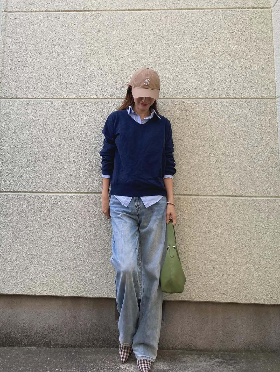 ボトムスにはカジュアルなデニムパンツを合わせ、シャツは前だけウエストインすることでメリハリをつけ、上品さと親しみやすさのバランスが絶妙に。