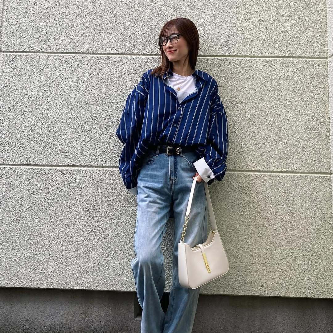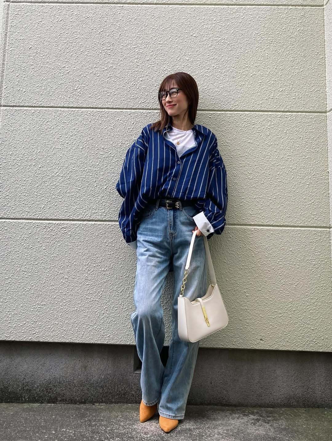 ネイビーベースに白のストライプが映えるオーバーシャツは、40代の秋コーデに知的な印象をプラスしてくれるアイテム。