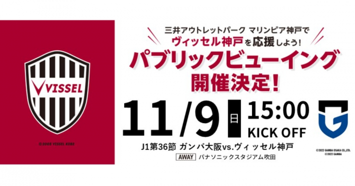 11月9日、三井アウトレットパーク マリンピア神戸(神戸市垂水区)で「ガンバ大阪vsヴィッセル神戸」のパブリックビューイングが開催されます。観戦無料。