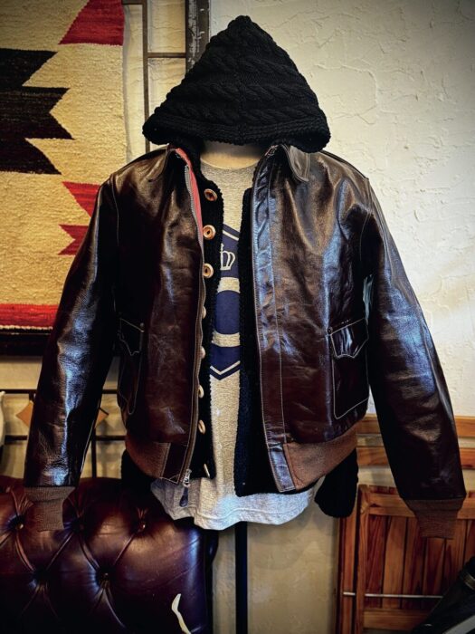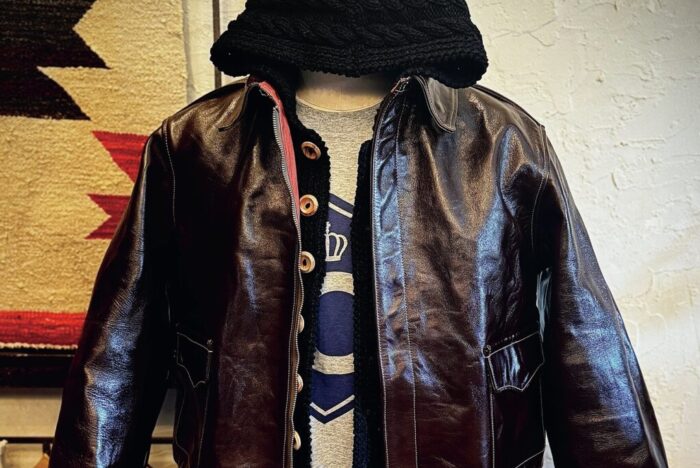 熱くなり過ぎた、話をオデコ靴に戻そう。雑誌に掲載されているようなブランド靴はなかなか買えなかった少年は、渋谷の地下街にあった小さな靴屋さんで、安価なオデコ靴を買った。それが精一杯の背伸び。光沢のあるチョコレートブラウンで丸味の強い、店頭で一番「おいしそうな」靴だった。光沢のあるシールブラウンのA-2を見ると、あのオデコ靴を思い出す。欲しいんだけど、太り過ぎて、身体に合うA-2とは出逢えなかった。ところが、ジャンキースペシャルがバズリクソンズにサイズ46と48を別注したと聞き、すぐに試着へ。当たり! いろんな意味でおいしい1着だ。