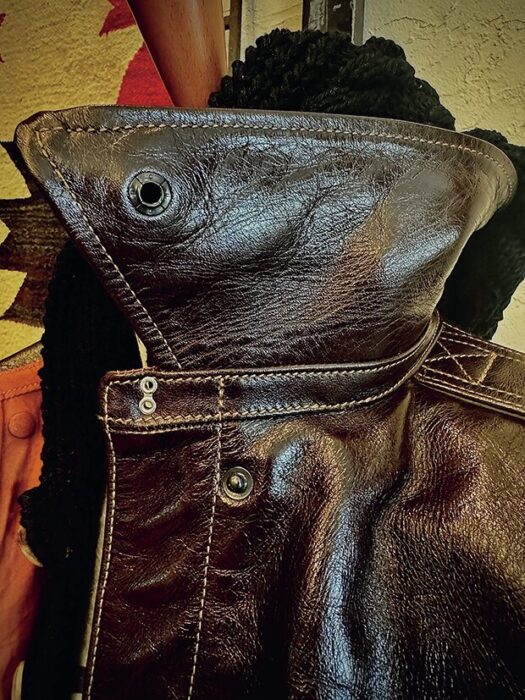 使用するホースハイドはイタリア原産。ベジタブルタンニン鞣しのハンドアニリンフィニッシュで、着用すればするほどアジが出てくる上質な1着を堪能する。