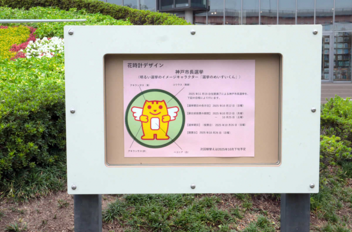 【神戸市長選挙に合わせたデザインに】いまはどんなデザインに?三宮・東遊園地の花時計だより 神戸市