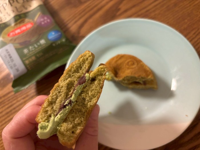 抹茶たい焼は、宇治抹茶のほろ苦さと粒あんの自然な甘みがバランスよく、上品な味わい。