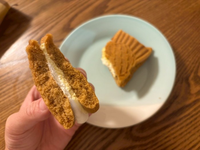 黒糖たい焼は、ふわもちの生地にまろやかなカスタードとミルククリームがよく合い、優しい甘さ。