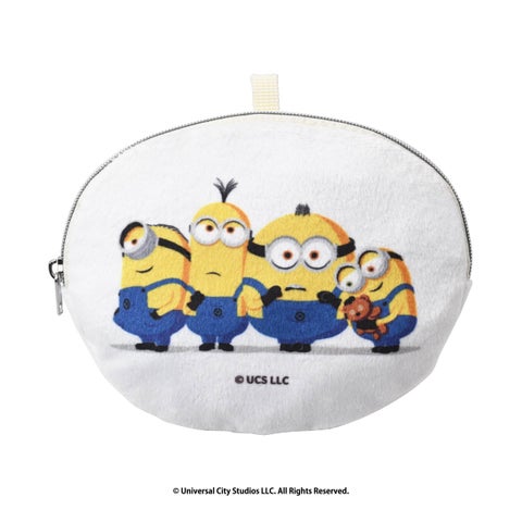 丸型のポーチには、仲良しのミニオンたちが集まったデザインが施されています。お気に入りの「ティム」を抱える「ボブ」の姿や、ぎゅっと密着するミニオンたちの姿がポイントです。幅約15cm×高さ約12cmの持ち歩きやすいサイズで、コスメや文房具などの小物収納に便利です。