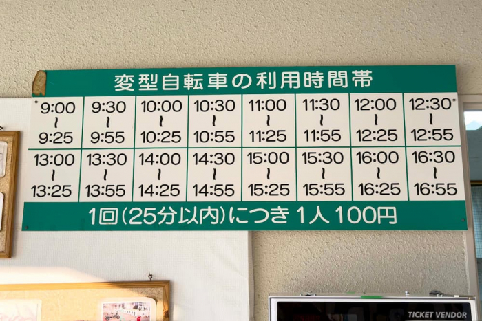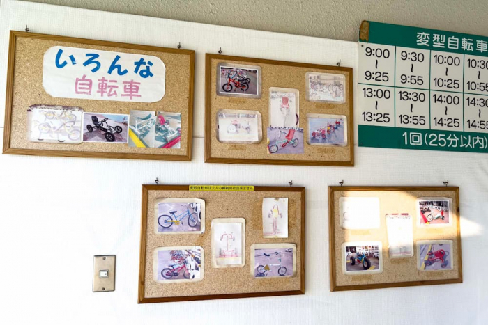 変形自転車の利用は1回25分以内。9時から16時55分まで、あらかじめ設定された時間に合わせてスタートします。広場内には常に施設スタッフがいて、安全に遊べるよう見守ってくれています。大人(中学生以上)は、一輪車のみ利用可能です。