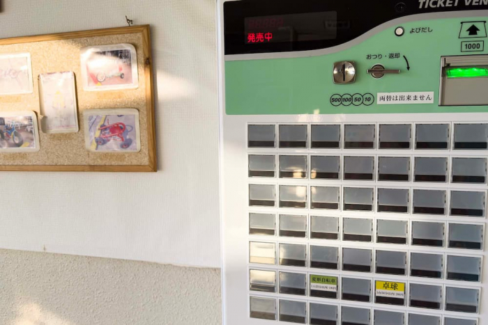 遊ぶ際は、券売機でチケットを購入します。両替機はないため、事前に100円玉を用意しておくのがおすすめ。ちなみに、卓球も1台(50分以内)200円で利用できます。