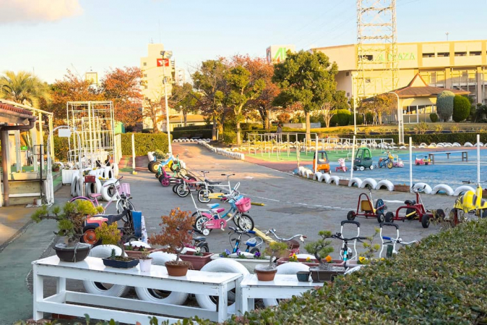 公園に入るとまず目に飛び込んでくるのは、カラフルな変形自転車が並ぶ広場。平日の夕方に訪れたところ、学校終わりの小学生や未就学児の姿も見られ、広場には笑い声があふれていました。