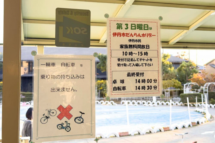 さらに、第3日曜日には「伊丹市だんらんホリデー」が設けられており、伊丹市民の家族連れを対象に園内が無料開放されます。※10時~15時(最終受付は卓球14時、自転車14時30分)