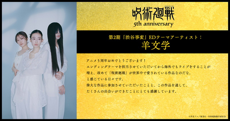 11月7日(金)に公開を迎えた『劇場版 呪術廻戦「渋谷事変 特別編集版」×「死滅回游 先行上映」』。このたび、出演キャスト&TVアニメ第2期「渋谷事変」EDアーティストより、アニメ『呪術廻戦』5周年お祝いコメントが到着した。