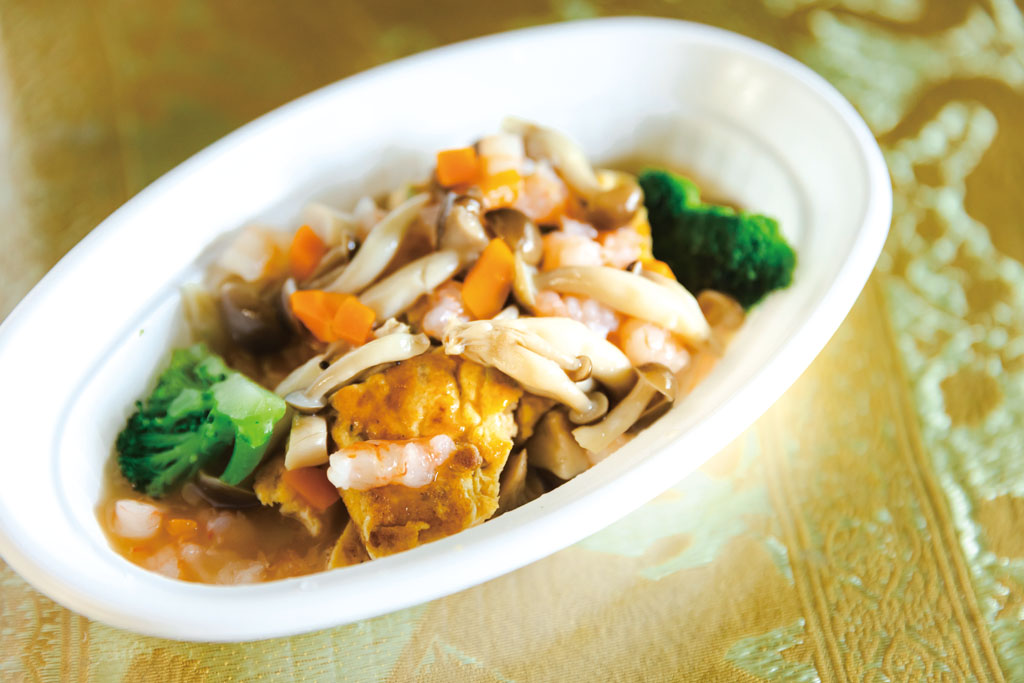 厚焼卵のえび塩味あんかけ 580円。ふんわり仕上げた厚焼玉子に、やさしい塩味の鶏ガラスープと野菜を。冬にホッとするおいしさを届けてくれる。不定期で登場。