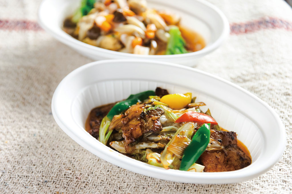 その日の3品の料理はウェブサイトでお知らせ、予約可。写真は回鍋肉片 580円。2品の盛り合わせセット 1,000円も人気。