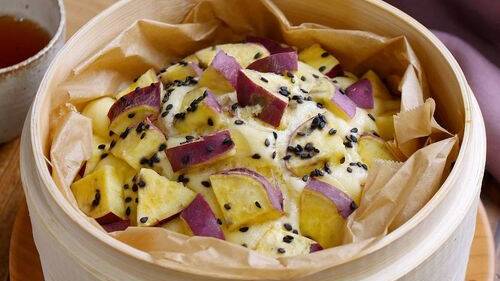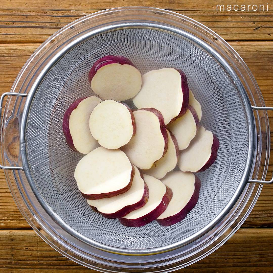 2: さつまいもを10分ほど水(分量外)にさらしてザルに上げ、水気を切ります。
