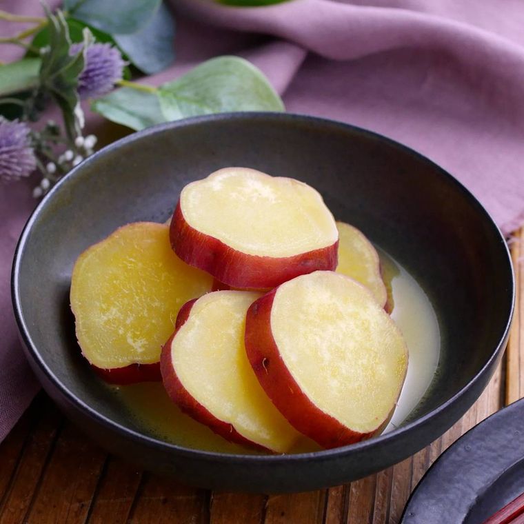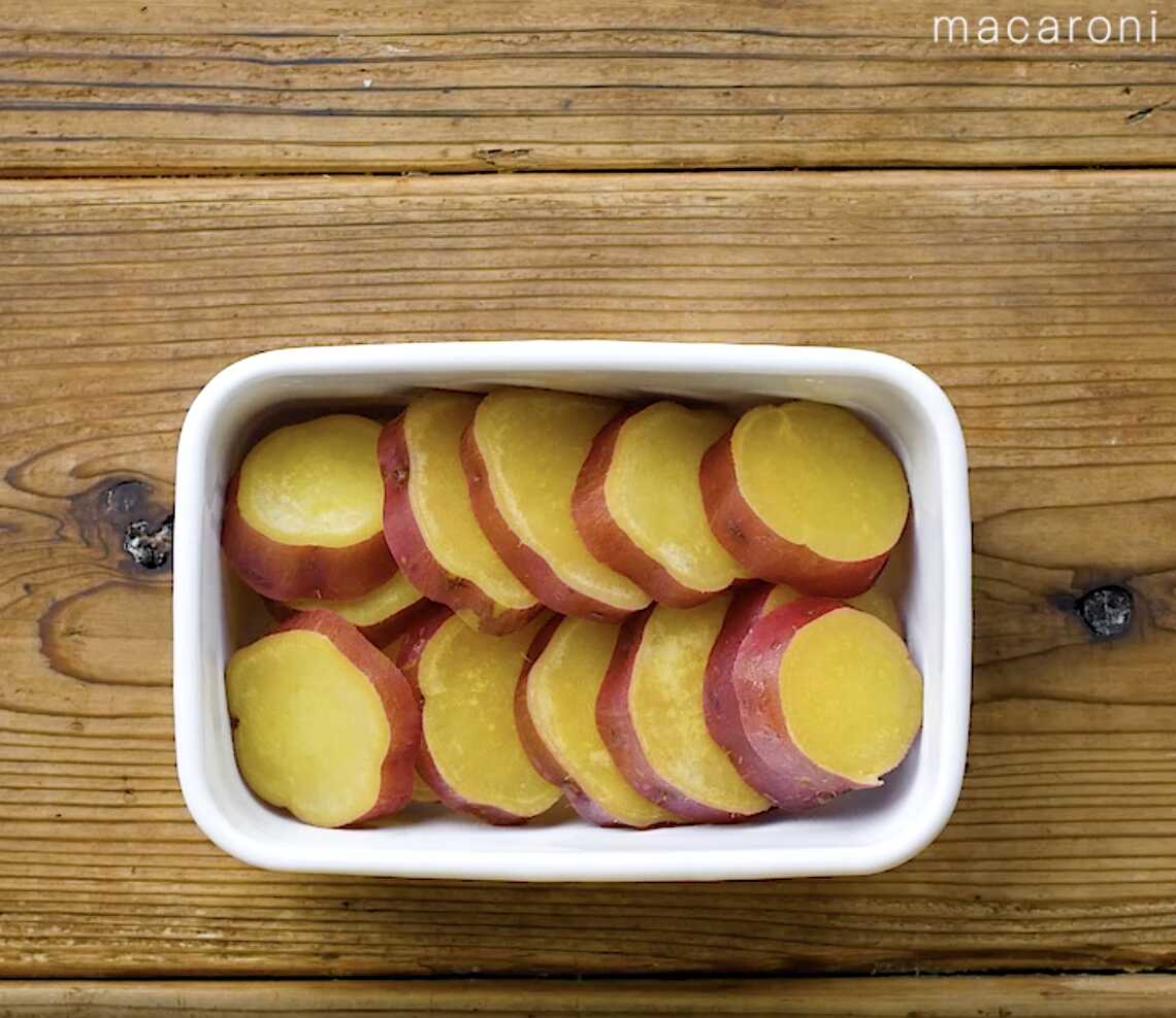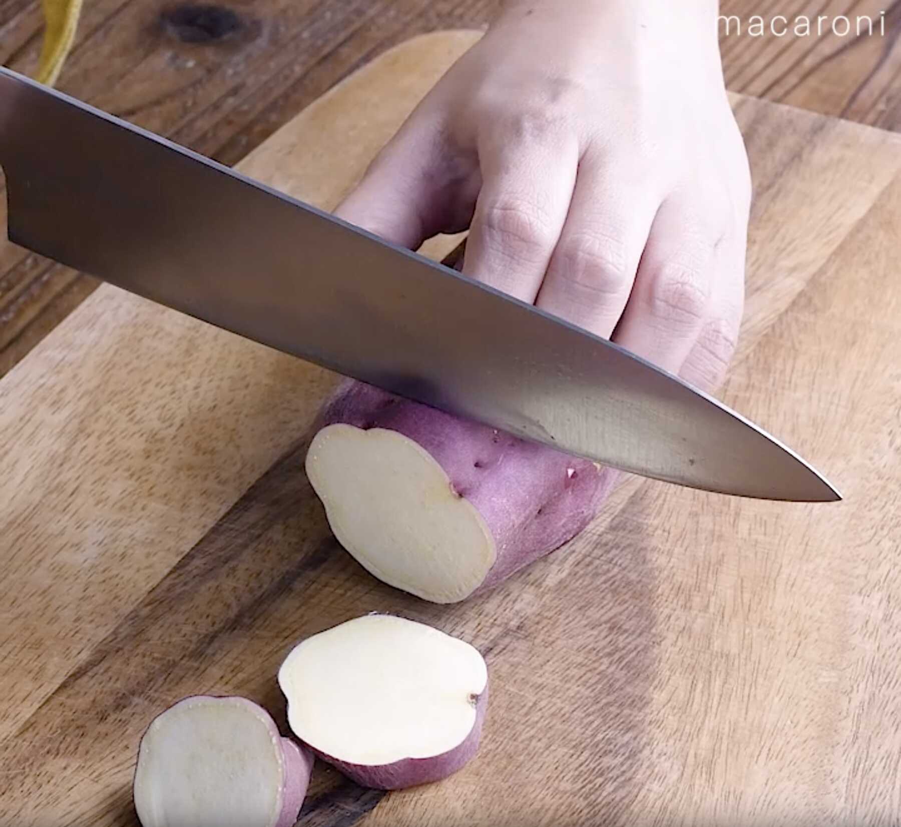 1: さつまいもは皮つきのまま1.5cm幅の輪切りにします。