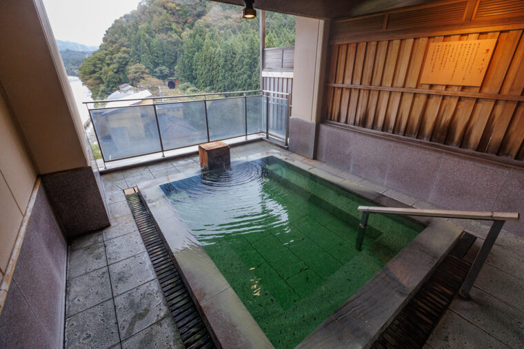 源泉をたたえた大浴場も素晴らしく、エメラルドグリーンの湯色が印象的な咲花温泉は、肌あたりがやわらかく湯上がりの肌はしっとり。