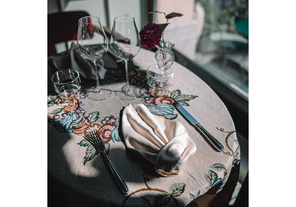 ノーラの夢は「古着ファッションと食への愛を融合させる」ことだった。リュ・マダムでもこのコンセプトを継承したいと考え、ヴィンテージハンドバッグを装飾として活用するアイデアが生まれた。リラブよりさらに落ち着いた、大人びた空間でありながら、装飾はフィンランドにしては大胆。ノーラが信じる、「減らすよりも増やす」という理想“モア・イズ・モア(more is more)”が具体化された結果だ。家具はフィンランドの職人による特注品とヴィンテージ品を組み合わせ、食器類も蚤の市で見つけた品やヴィンテージ品をカスタムメイドするMunkaa社によるものだ。
