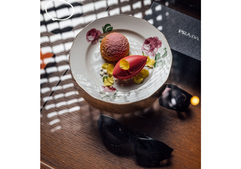 プラダのヴィンテージ・サングラスなど、小物やアクセサリーもさりげなく陳列。来店する度に新しいアイテムに出会う楽しみも提供している。料理はフランスやイタリアの影響を受けながら、フランスの“言葉にできない何か( je ne sais quoi)”の感覚も取り入れている。