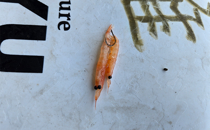 コマセは、チヌ釣りとなることから、チヌ用の配合エサにオキアミを混ぜて使うことになる。サシエサは生オキアミ、加工オキアミ、各種ネリエサ、コーンなどエサの取られ方次第で、雑食性のチヌが食べるものなら何でも試してみる価値はある。