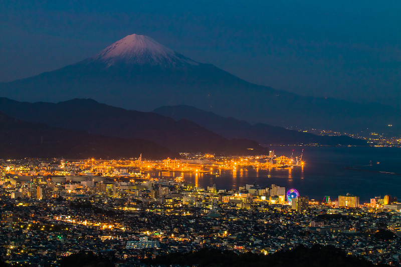 静岡市は、北は南アルプス、南は駿河湾に面した豊かな地形を持ち、その山々から見下ろす夜景は格別です。オレンジ色に輝く清水港や煌めく市街地の光、そして晴れた日には遠く富士山のシルエットや湾曲する海岸線までを一望できます。
