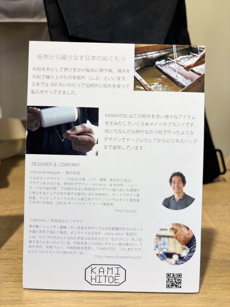 KAMIHITOEのものづくりは、その両方を見事に成立させていて、まさに「紙布の可能性を最大限に活かす」という言葉の通りだと思いました。