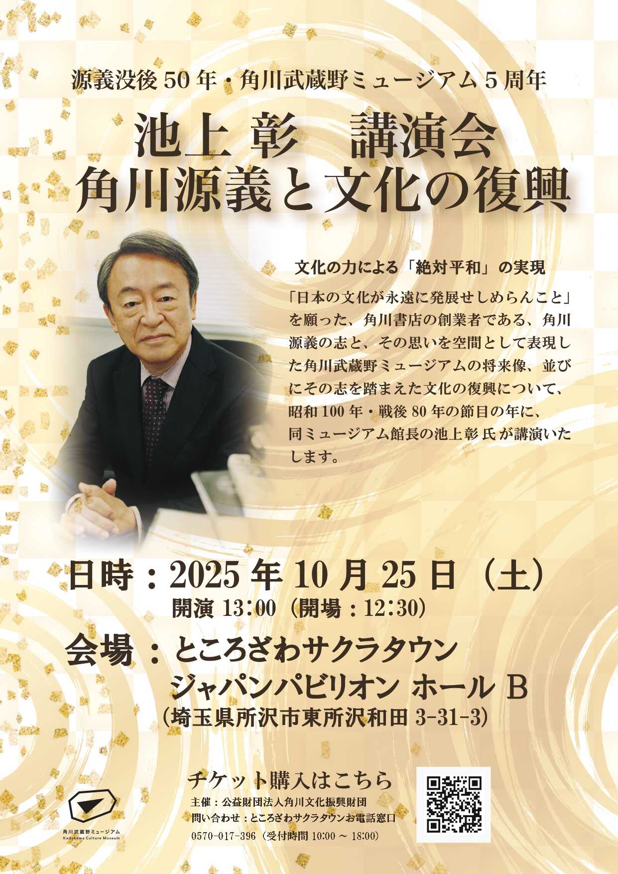 「日本の文化が永遠に発展せしめらんこと」を願った角川源義の志と、その思いを空間として表現した角川武蔵野ミュージアムの将来像ならびにその志を踏まえた文化の復興について、昭和100年・戦後80年の節目の年に、同ミュージアム館長の池上彰氏が講演します。