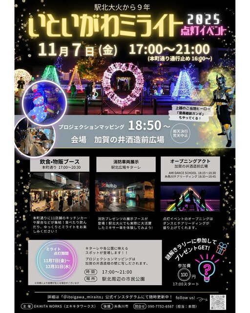 点灯初日である11月7日(金)の17時からは、糸魚川駅北の各エリアにて点灯イベントが開催されます。