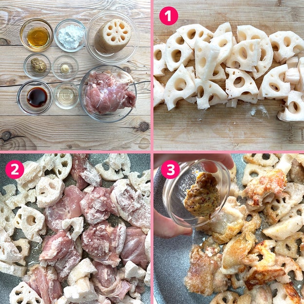 ① れんこんは皮をむき、7〜8mmの厚さのいちょう切りにする。鶏もも肉は一口大に切り、塩コショウ(分量外 適量)を振る。ポリ袋に入れ、片栗粉を加えて全面にまぶしつける。