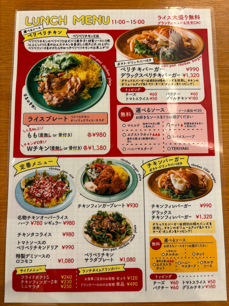 他にも「チキンオーバーライス」「タコライス」「チキンドリア」「ロコモコ」など、ペリペリチキン以外のメニューも充実しています。