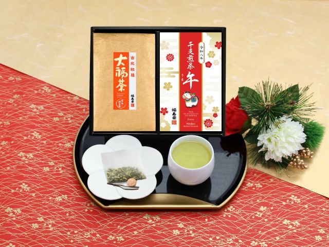 福寿園「干支煎茶・大福茶詰合せ(干支煎茶50g、大福茶かりがね[3g×10袋、福梅・福昆布×各10個])」(3,348円)