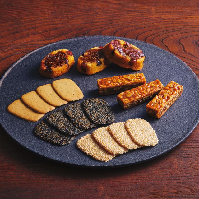 菓子wabiyaの「京wabiya三昧 M」は、ごま香る薄玻璃チュイルとくるみとキャラメルの琥珀ヌガー、贅沢なフルーツケーキまで、素材と職人の技が響き合います。