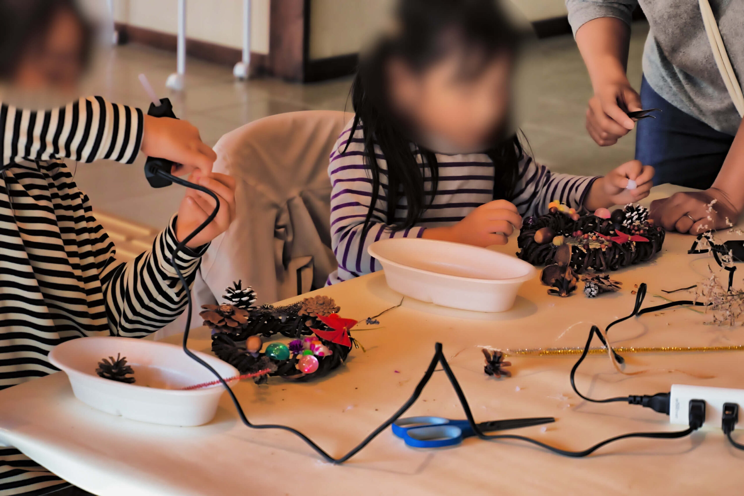 松ぼっくりやどんぐり、ドライフラワーやリボンなどを自由に組み合わせて、自分だけのリースを作るこの体験は、子どもたちに大人気。夢中になって手を動かす姿や、完成したリースを嬉しそうに見せ合う様子がとても印象的でした。
