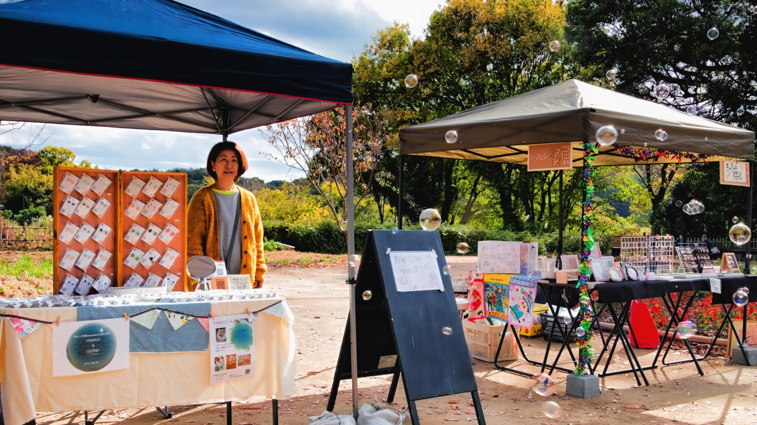 さらに、芝生広場周辺ではフリーマーケットも開催されており、手作りのアクセサリーや古着、絵本など、さまざまな品が並んでいました。