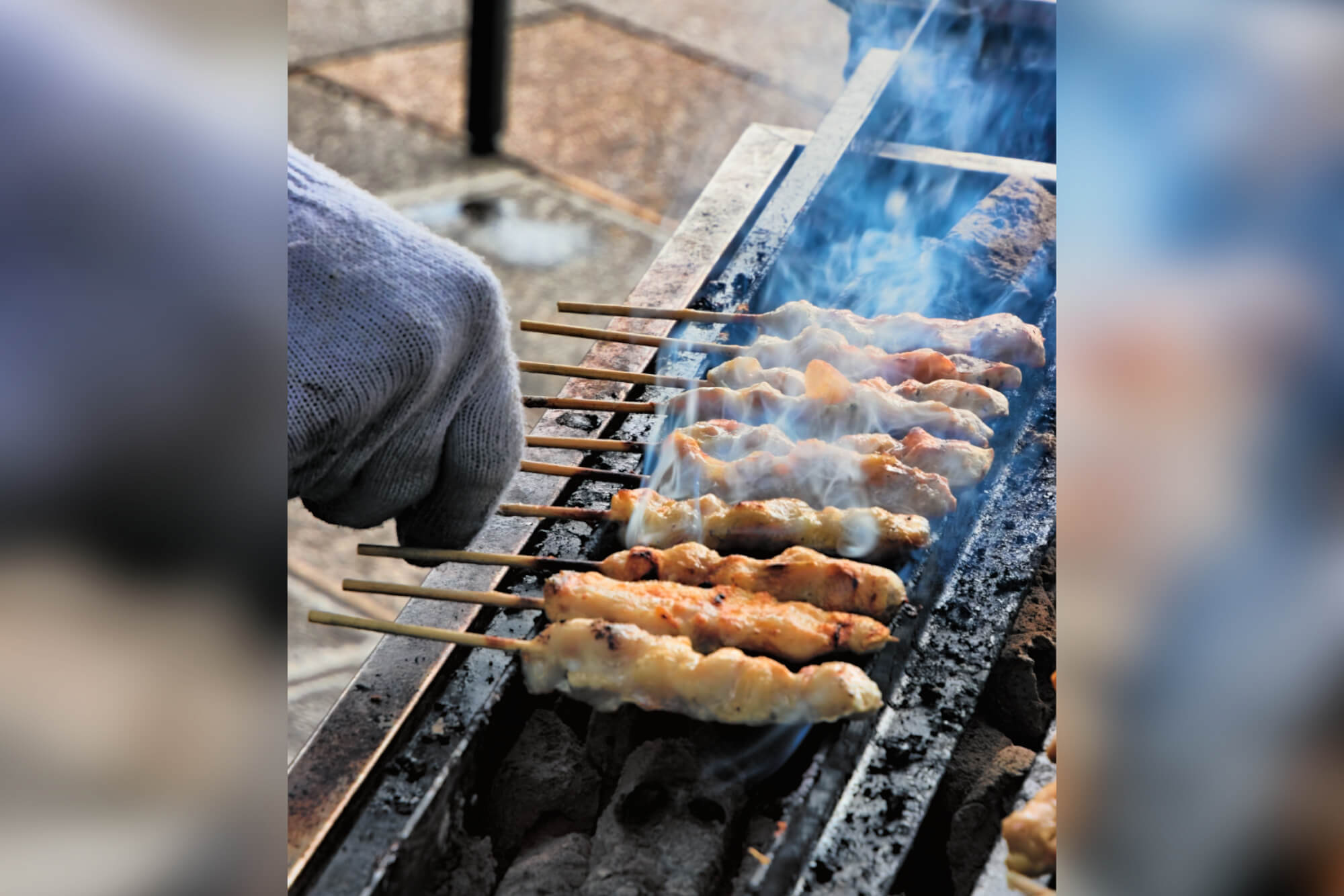 特に目を引いたのは、炭火で焼かれる焼き鳥の屋台。煙の向こうから漂ってくる香ばしい匂いに誘われて、思わず足が止まります。