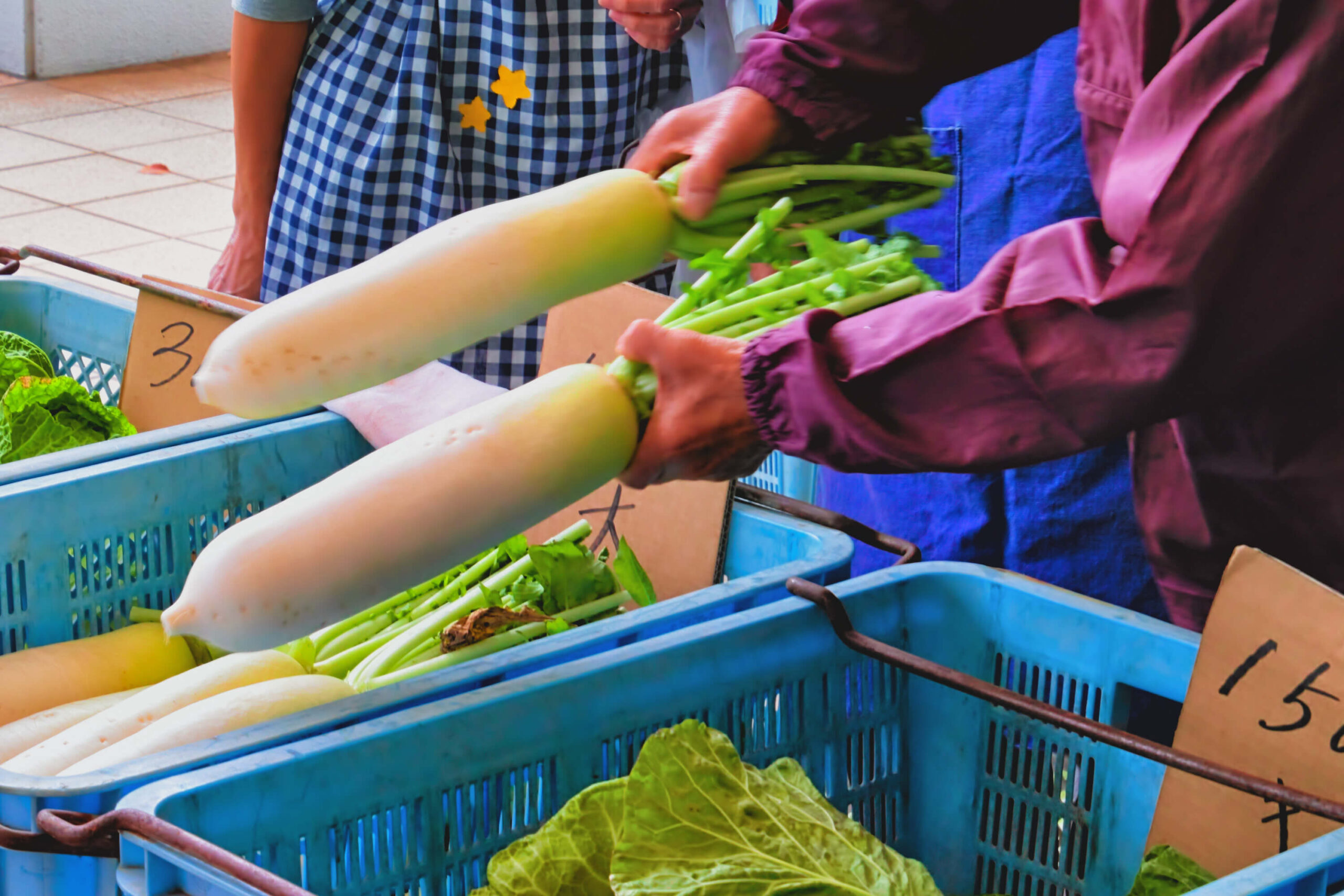 瑞々しく新鮮な野菜が手頃な価格で販売されており、訪れた人たちは次々と手に取り、あっという間に売り切れてしまうほどの人気ぶり。