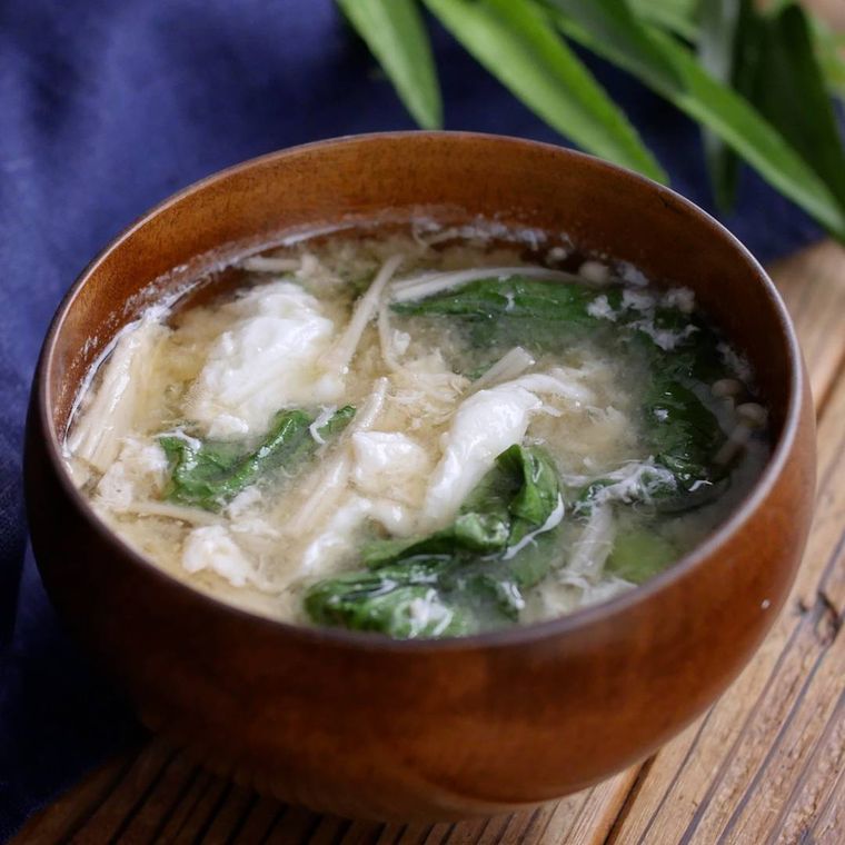 3: 小松菜の葉部分を加えてさっと煮たら弱中火くらいの軽く煮立つくらいにして、卵白を加えます。